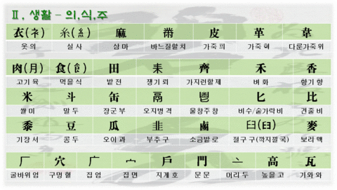 - 玉(구슬 옥):세개의 구슬을 실로 꿰뚫은 모양. 왕, 아름답다, 가꾸다 등의 뜻도 있다.