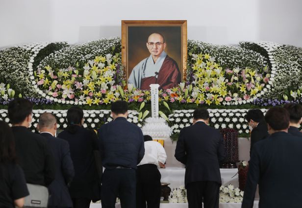 <YONHAP PHOTO-2580> 월주 스님을 기리며 (김제=연합뉴스) 임채두 기자 = 조계종 전 총무원장 월주(月珠) 스님이 열반한 이튿날인 23일 전북 김제시 금산사 분향소에서 조문객들이 조문하고 있다. 2021.7.23 doo@yna.co.kr/2021-07-23 14:08:10/ <저작권자 ⓒ 1980-2021 ㈜연합뉴스. 무단 전재 재배포 금지.>