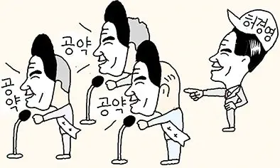 ▶여야 대선 주자들의 공약도 다 합치면 수천조원이 들지만 재원 대책은 허씨만도 못하다는 지적을 받는다. 재정 구조개혁이니 조세 감면 축소, 토지세·탄소세 징수 등의 추상적인 아이디어만 늘어놓고 구체적인 방법엔 침묵하고 있다. ‘역세권 기본주택 건설’을 공약한 사람에게 ‘땅이 어디 있냐’는 질문이 나오자 그는 “집을 짓는 곳에 역을 만들면 된다”는 식으로 대응했다. 개그가 따로 없다. 급기야 허씨가 “30년 전 내가 국민 배당금을 줘야 한다고 말할 때 미친놈 취급하더니 지금은 모두가 따라 한다”며 ‘저작권’을 주장할 지경이 됐다. 틀리지 않는 말이다.