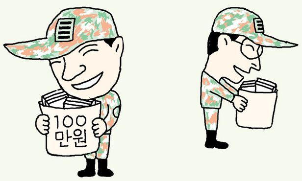 ▶월급 더 준다는데 누가 마다하겠는가. 보상 없는 충성을 뜻하는 ‘애국 페이’를 청년에게 강요하는 것은 시대착오적이란 지적도 있다. 군 가산점 혜택이 없어진 마당에 급여 인센티브라도 있어야 하는 것 아니냐는 주장도 일리가 있다. 그러나 청년에게 군대 급여 인상보다 중요한 것은 제대 이후 펼쳐질 미래다. 한 세대 전엔 비록 빈손 제대를 해도 크게 억울해하지 않았다. 일자리는 풍족했고 결혼하면 몇 해 안에 내 집이 생겼다. 많은 20대가 정권을 성토하는 건 사병 월급이 적어서가 아니다. 아버지가 청년일 때 꿈꾸던 미래를 자기는 꿀 수 없다는 좌절감 때문이