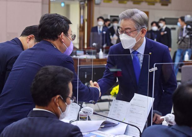 이재명 경기지사가 18일 경기도청에서 열린 국회 행정안전위원회의 경기도에 대한 국정감사장에 들어와 의원들과 인사하고 있다. /공동취재단