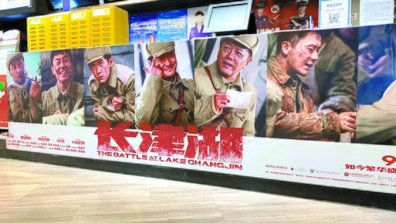 6ㆍ25 전쟁을 소재로 제작돼 1억명 이상의 관객을 동원한 중국의 애국주의 영화 '장진호'의 선전 간판들이 베이징의 한 극장 계산대에 붙어 있다. [중앙포토]
