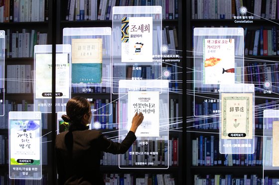 지난해 3월 서울 서초구 국립중앙도서관 디지털도서관에서 열린 실감서재 개관행사에서 관계자가 도서관 빅데이터를 활용한 터치 스크린을 시연하고 있다. 빅데이터는 정보기술(IT) 기업 뿐 아니라 도서관 등 사회 모든 분야로 확산하고 있다. [뉴스1]