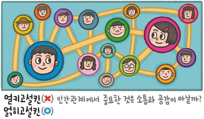 위 두 문장에는 공통점이 있어요. '얽히고설킨'을 '얼키고설킨'으로 잘못 쓴 거예요. '얽히고설키다'를 [얼키고설키다]로 발음하다 보니 이처럼 잘못 쓰는 경우가 많아요. 간혹 '얽히다'와 '섥히다'가 합쳐진 말로 착각해 '얽히고섥히다'로 쓰는 경우가 있는데, '얽히다'라는 말은 있어도 '섥히다'라는 말은 없답니다.