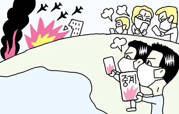 ▶인류가 전쟁을 생중계한 것은 1991년 걸프전 때가 처음이다. 인공위성 덕분이었다. 러시아의 침략으로 전쟁터가 된 우크라이나에선 인공위성 대신 휴대전화가 전쟁 현장을 실시간 중계한다. 미사일 폭격으로 공항, 무기고, 고층 아파트가 파괴되는 참상에 소름이 돋는다. 공포와 분노를 토로하거나 투쟁을 다짐하는 우크라이나인들 목소리도 생생하다.