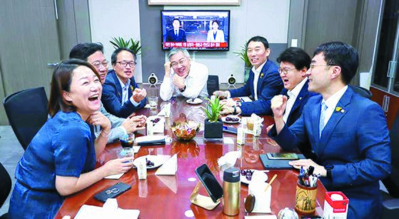 2020년 7월 당시 최강욱 열린민주당 대표와 황운하 더불어민주당 의원 등 '처럼회' 회원들이 한 자리에 모여 웃고 있다. [페이스북 캡처]