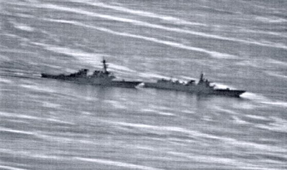 지난 2018년 9월 30일 미 디케이터함(왼쪽)과 중국 란저우함(오른쪽)이 남중국해에서 초근접 대치하고 있는 모습. 미 해군은 당시 두 군함의 거리는 41m에 불과했다고 발표했다. [중앙포토]
