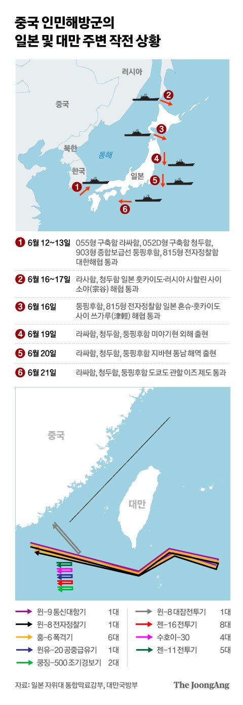 일본 방위성의 통합막료감부(합동참모부)에 따르면 같은 날인 21일 중국 최신예 구축함과 보급함으로 편성된 함대가 도쿄 남부 이즈(伊豆) 제도를 통과해 서진했다. 지난해 3월 취역한 1만2000t(톤)급 최신예 055형 구축함인 라싸함(선체번호 102)과 052D형 구축함 청두함(120), 903형 종합보급함인 둥핑후함 편대다. 이들 함대는 지난 12일 대한 해협의 쓰시마섬 남쪽을 통과해 동해로 진입하는 모습이 처음 탐지됐다. 이후 16일과 17일 일본 홋카이도와 러시아 사할린 사이 소야(宗谷) 해협과 혼슈·홋카이도 사이의 쓰가루(津輕) 해협을 각각 통과하고 19일 다시 합류해 20일 지바(千葉)현 동남부 220㎞ 해역에 출현해 남서진했다.
