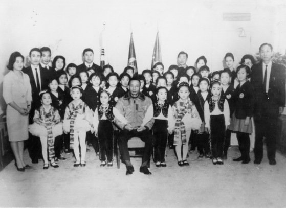 1961년 12월2일 국가재건최고회의 의장공관을 찾은 부산 문화방송 어린이 합창단 어린이들의 팔을 어색한듯 뻣뻣하게 잡고 포즈를 취한 박정희 의장. 왼쪽끝이 문화방송 오너 김지태. 박정희는 62년 5월 김지태로부터 부산문화방송을 헌납받아 516장학회에 맡겨 전국방송으로 키웠다. 이후 김지태의 사업은 번창했다. 박정희는 1959년 부산 군수사령관 시절부터 김지태와 친했다.