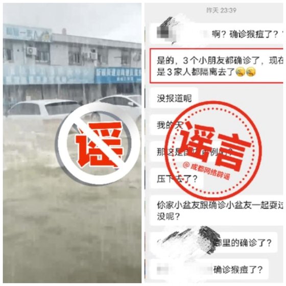‘닝보시가 태풍 무이파에 침수됐다는 영상은 가짜’(왼쪽), ‘청두시에서 원숭이두창 확진자 출현 거짓’(오른쪽). [중국 유언비어 반박 플랫폼 캡처]