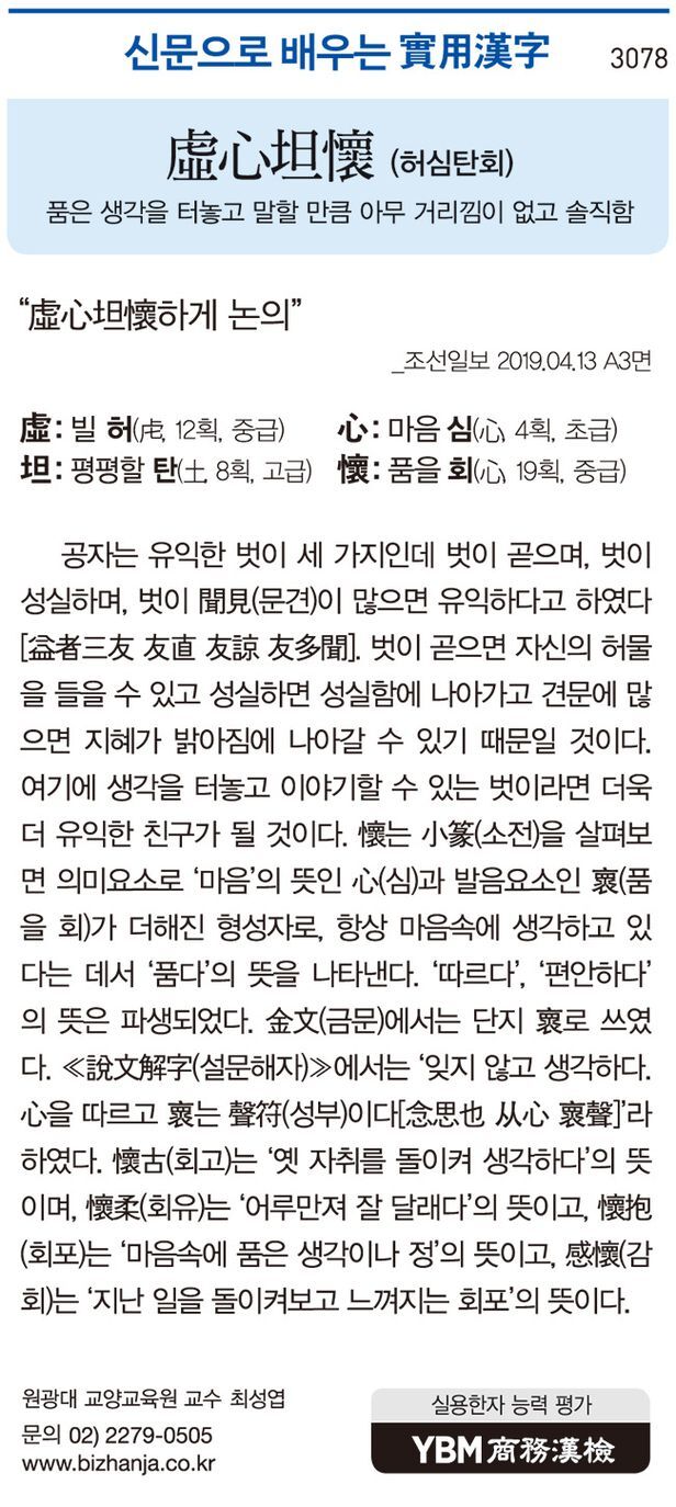 [신문으로 배우는 실용한자] 허심탄회(虛心坦懷)