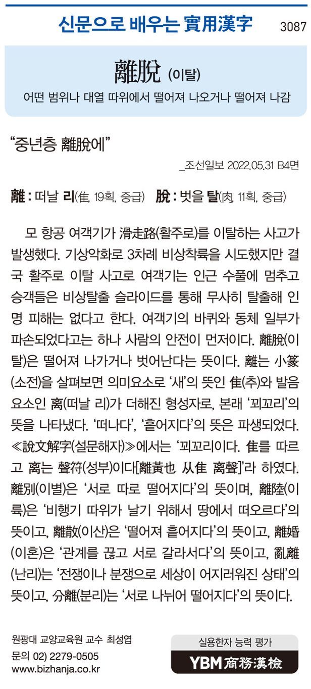 [신문으로 배우는 실용한자] 이탈(離脫)