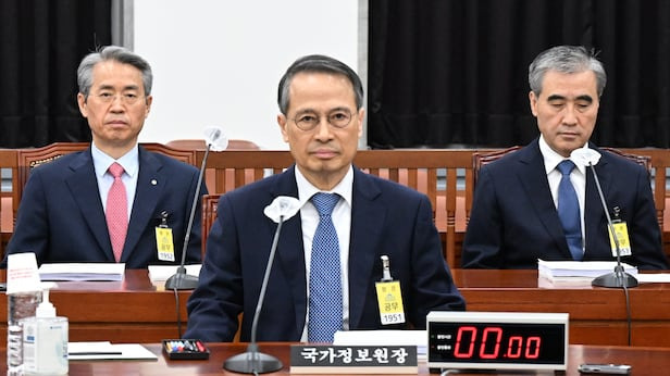 김규현 국가정보원장이 23일 오전 서울 여의도 국회에서 열린 정보위원회 전체회의에 출석해 자리하고 있다. 왼쪽부터 권춘택 1차장, 김 원장, 김수연 2차장./ 이덕훈 기자