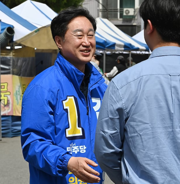 제22대 국회의원선거 수원정에 출마한 김준혁 더불어민주당 후보가 지난 2일 경기도 수원시 매탄동에서 시민들에게 인사하며 지지를 호소하고 있다./뉴시스