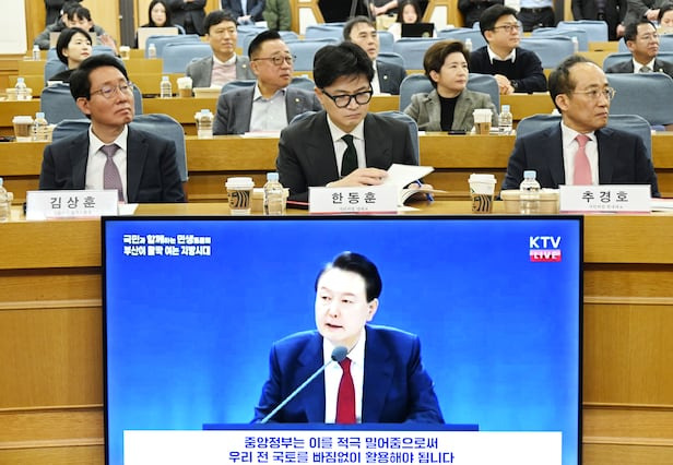 한동훈 국민의힘 대표가 지난 26일 오전 서울 여의도 국회 의원회관 소회의실에서 열린 '국민의힘 초선의원 공부모임 네 번째-지방시대, 지속가능한 대한민국 성장 동력' 행사에서 자료를 보고 있는 가운데 윤석열 대통령의 영상이 상영되고 있다. /이덕훈 기자