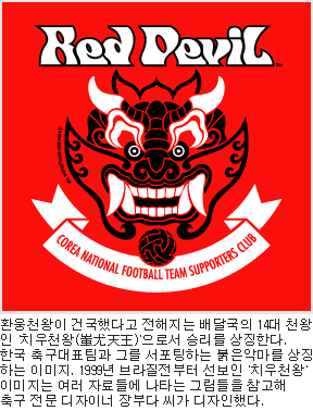 1999년 3월 29일 ‘한국-브라질전’이 열린 잠실 주경기장에서 처음 선보인 치우천왕의 깃발은 지금까지도 ‘붉은 악마’의 공식캐릭터로 사용되고 있다.