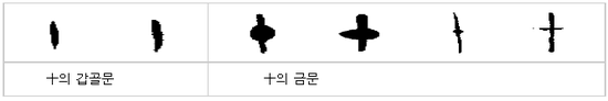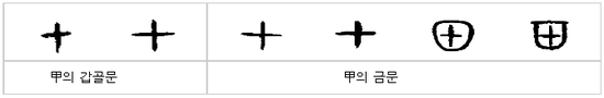 그렇다면 十(열 십)과는 어떻게 구분이 될까? 원래 十은 진흙을 뭉쳐 놓은 모양으로 시작했다가 금문에 가서야 甲의 갑골문 형태와 비슷하게 된 것이다.