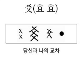 爻(사귈 효, 가로 그을 효)는 실이나 새끼를 교차되게 짜거나 매듭짓는 모습이며, 이로부터 그렇게 짠 면직물이나 ‘섞인 것’을 뜻하게 되었다.