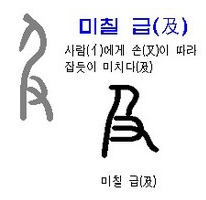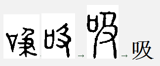 원래 及(미칠 급)은 사람을 손으로 붙잡은 꼴로 ’붙잡다’, ‘체포하다’, ‘도달하다’의 뜻을 가지고 있다. 그런데 여기서는 숨을 빨아들일 때 나는 소리인 ‘흡 <- 급(及)’, 즉 들숨 소리의 의성어에 口(입 구)가 합쳐져서 吸(마실 흡)이 된 것이다.