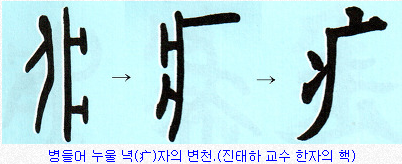 疒(병들어 기댈 녁)은 병든 사람이 침대에 누워 있는 모습을 그린 글자다. 즉, 이 글자를 부수로 하는 글자는 ‘병’과 관련이 있다. 가장 대표적인 글자가 病(병들 병)이다.