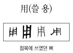 用(쓸 용)의 경우는 풀이에 대한 학설이 구구하다. 중요한 일의 시행을 알리는 데 쓰는 ‘종’으로부터 ‘시행’의 뜻이 나왔다고도 하지만, 자세히 살피면 가운데가 卜(점 복)이고, 나머지가 歹(살바른 뼈 알)로 구성되어 점볼때 쓰던 뼈를 그렸다는 설도 일리가 있어보인다.