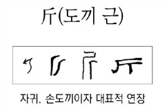 斤을 ‘도끼’라고 풀이하지만, 갑골문을 보면 자귀(나무를 깍아 다듬는 연장의 하나, 오른쪽 사진)를 그린 것이다. 도끼는 날이 세로로 되었지만 자귀는 가로로 되어있으며, 나무를 쪼개거나 다듬을 때 사용하던 대표적 연장이다. 그래서 斤에는 ‘쪼아 다듬거나 끊는다’는 의미까지 함께 들어 있다.