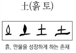 갑골문을 보면 땅위에 뭉쳐 세워 놓은 흙의 모습?이라고 한다.. 어떤 경우에는 그 주위로 점을 그려 술을 뿌리며 숭배하던 토지신의 모습?을 그리기도 했다.