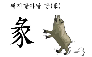 彖( 돼지 달아날 단, 단 단)은 와 彑(돼지머리 계)와 豕(돼지 시)의 합성어로, 돼지가 머리를 쳐들고 달려가는 모습을 그린 것이다. 하지만, 돼지머리와 돼지가 합쳐졌으니 낱낱이 한데 묶여있는 ‘단’을 뜻하기도 것이다.