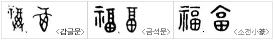 畐(가득할 복)은 갑골문과 금문 모두 목이 긴 항아리 모양의 술독, ‘신에게 바치는 가득담긴 술통’을 나타낸다. 즉 福(복 복)은 신에게 술을바쳐 술통처럼 풍족하게 그득차서 행복해지기를 빈다는 뜻이다.