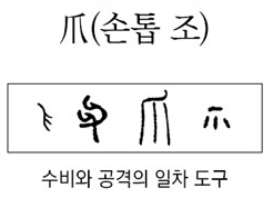 采(캘 채)는 다시 爪(손톱 조)와 木(나무 목)으로 나눠지는데, 갑골문에 나온 爪의 모습은 ‘무엇인가 쥐려는 손’의 모습이다.