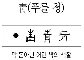 따라서 靑(푸를 청)은 초목이 생장하기 시작할 때의 상징으로 ‘봄날 초목의 어린싹에서 볼 수 있는 그런 초록’을 의미한다.