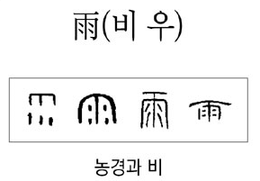 雨(비 우)는 구름에서 빗방울이 떨어지는 현상을 나타내기 위하여, 둥근 하늘을 그리고 빗방울이 땅으로 떨어지는 모양을 본뜬 글자다.