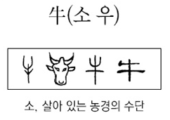 牛(소 우)는 소의 머리를 정면에서 바라본 모양을 본뜬 글자이다.