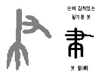 · 손으로 붓을 잡은 모양을 본뜬 것인데, 뒤에 竹(대나무 죽)을 더하였다.