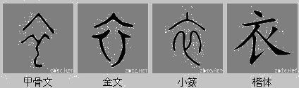 그리고 갑골문에 보이는 衣(옷 의)는 사람의 목 부분을 앞 뒤로 감싸고 있는, 즉 ‘잘 여민 옷 깃’을 그린 모습으로 ‘上衣(상의)’를 뜻하고, 下衣(하의)는 길게 늘어뜨린 뜻을 지닌 常(늘 상)을 더해 裳(치마 상)을 만들게 되었다.