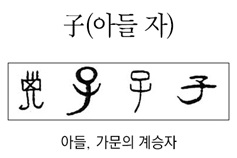 子(아들 자)는 갑골문에서머리칼이 달린 큰 머리와 몸체를 그려 갓 태어난 ‘아이’를 형상화했다. 이후 금문에 들면서 머리와 두 팔을 벌린 어린아이의 모습으로 변하게 되었다.
