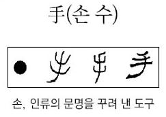 扌(손 수 = 手)는 금문부터 등장하기 시작하는데, 손의 모습을 특이하게 그려서 나타내었다. 어찌보면 나뭇잎이나 가지처럼 보이기도 하지만, 손의 뼈대를 형상화했다고 보면 된다.
