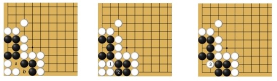위의 그림에서 백이 a에 두는 것이 自充(자충)으로 보이지만 흑2로 따먹힌 후에 다시 백3으로 끊으면 흑을 잡을 수 있다. 이것이 後切手(후절수)인데, 실전에서는 거의 보기가 힘들다.