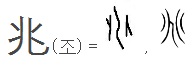 兆(조 조)는卜(점 복)처럼 금이 가고 또 가서 갈라진 모습을 나타낸 글자다. 점을 칠 때의 조짐을 나타낸다고 해서 ‘조짐’의 뜻도 있고, 무수히 갈라져서 셀수 없이 많은 수를 나태내어 숫자 ‘조’가 된 것이다.