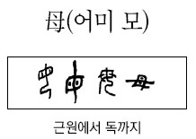 母(어미 모)는 단순히 간난아기에게 젖을 먹이는 역할에 머물지만은 않는다. 애가 성장할 시기에는 회초리로 가르치고 훈육하는 것을 포함한 성장 과정의 모든 것을 나타낸다. 그래서 母國(모국) 또는 母國語(모국어)라는 말을 사용하는 것이다.